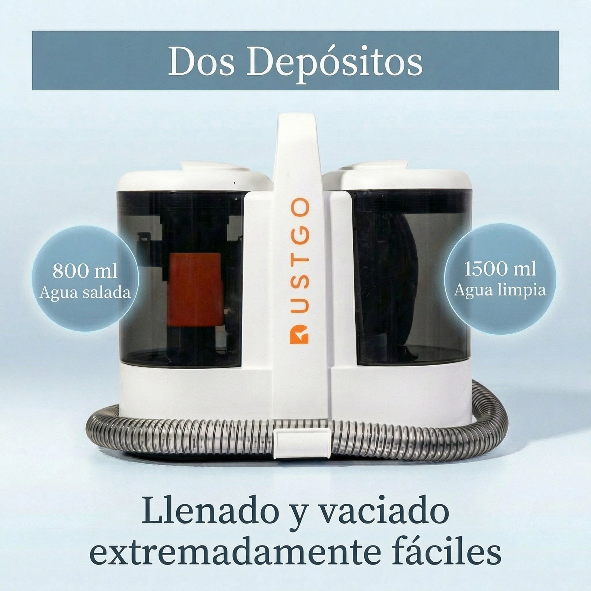 El Dustgo tiene un depósito de agua limpia de 1,6 litros y otro depósito de agua sucia de 800 ML.